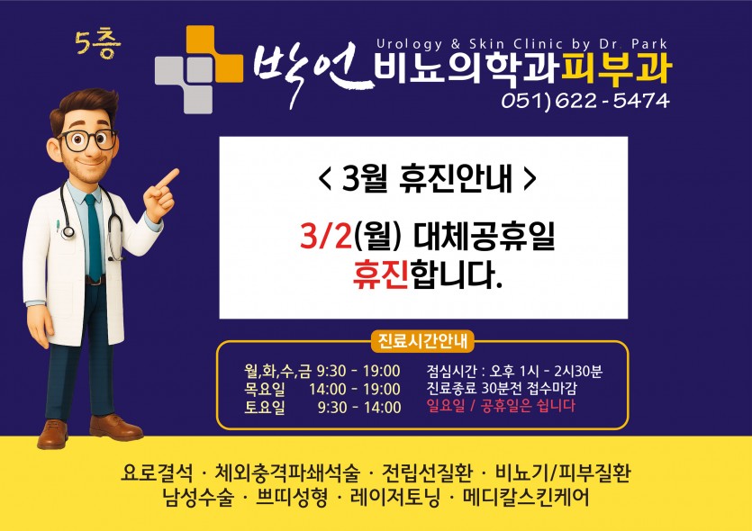 2026년 3월 휴진안내 페이지 정보 작성자 최고관리자 댓글 0건 조회 36회 작성일 26-02-27 11:38 본문 . 목록 다음글 2025년 11월 휴진안내 댓글목록 댓글목록 등록된 댓글이 없습니다.